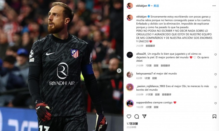 3月13日訊 馬競在本輪歐冠主場被皇馬點(diǎn)球淘汰,門將奧布拉克在不久前通過社媒發(fā)文。