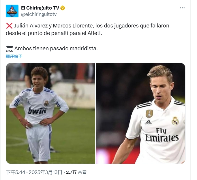 西班牙六臺(tái)曬出兩人舊照,表示這兩名球員都曾身穿皇馬球衣,阿爾瓦雷斯11歲時(shí)曾參加皇馬的試訓(xùn),但并未加盟。略倫特則是出自皇馬青訓(xùn),在2019年以3000萬轉(zhuǎn)會(huì)費(fèi)加盟馬競(jìng)。