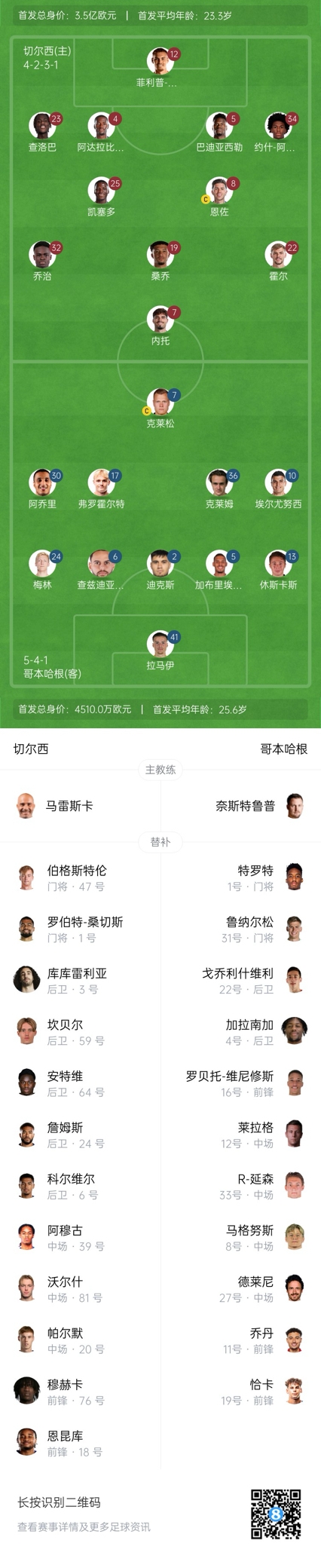 切爾西替補(bǔ):1-羅伯特-桑切斯、47-伯格斯特倫、6-科爾維爾、59-坎貝爾、3-庫(kù)庫(kù)雷利亞、64-安特維、24-里斯-詹姆斯、39-阿穆古、81-沃爾什、20-帕爾默、76-穆赫卡、18-恩昆庫(kù)