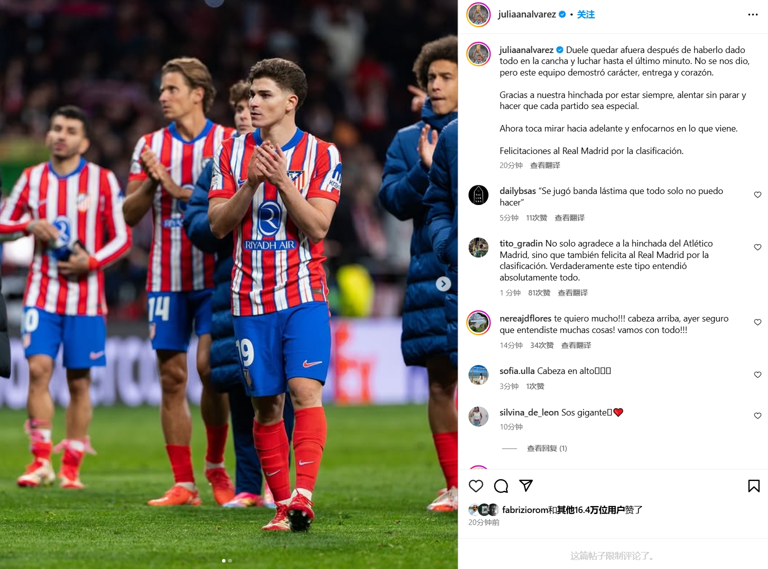 03月14日訊 歐冠16強對決,馬競在點球戰(zhàn)不敵皇馬,阿爾瓦雷斯點球戰(zhàn)點球罰進但因二次觸球被判無效。阿爾瓦雷斯如今在社媒發(fā)文談到感想。