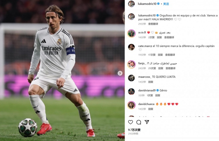 莫德里奇曬出自己的比賽照并配文:“我為我的球隊和俱樂部感到驕傲。讓我們繼續(xù)贏得更多?。?!馬德里前進?。?!”