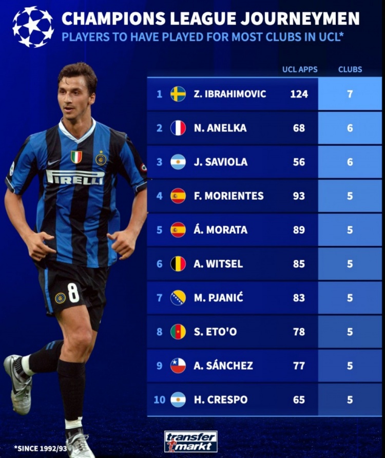 歐冠改制后代表最多球隊(duì)參賽榜:伊布7隊(duì)居首,阿內(nèi)爾卡次席