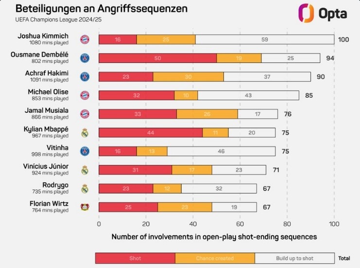 3月14日訊 拜仁官方宣布基米希與球隊(duì)續(xù)約,數(shù)據(jù)網(wǎng)站OPTA統(tǒng)計(jì),基米希是本賽季歐冠運(yùn)動(dòng)戰(zhàn)參與形成射門進(jìn)攻次數(shù)最多的球員,具體榜單如下(射門+創(chuàng)造機(jī)會(huì)+組織形成射門的進(jìn)攻):