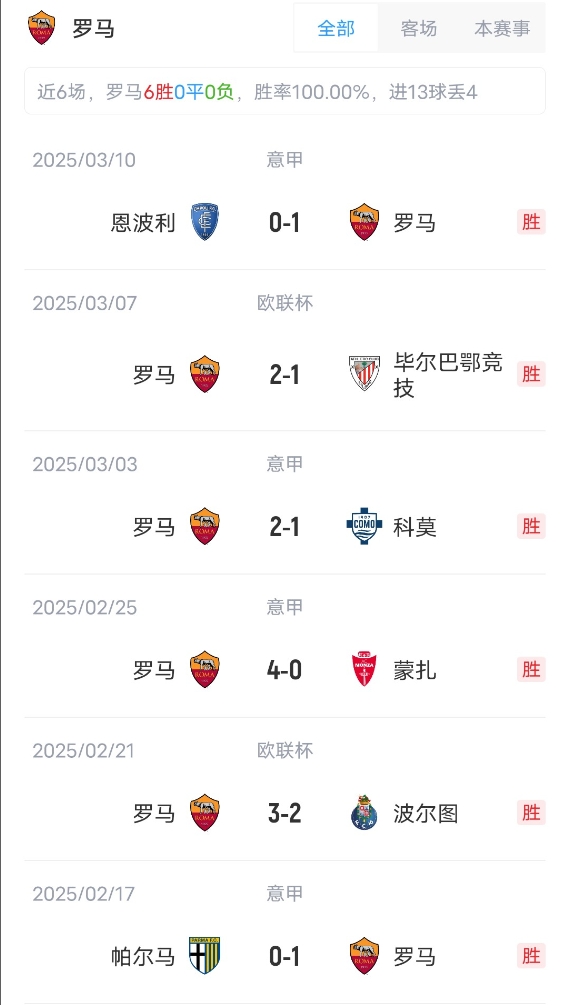 羅馬首發(fā):99-斯維拉爾、5-恩迪卡、15-胡梅爾斯、23-曼奇尼、3-安吉利諾、16-帕雷德斯、4-克里斯坦特、2-倫施、35-巴爾丹齊、21-迪巴拉、11-多夫比克