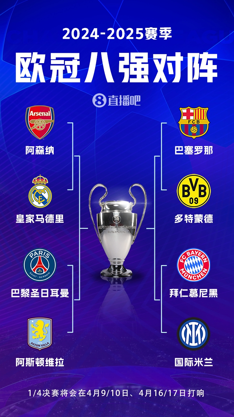 歐冠8強(qiáng):拜仁、國米、巴薩、多特、巴黎、維拉、阿森納、皇馬