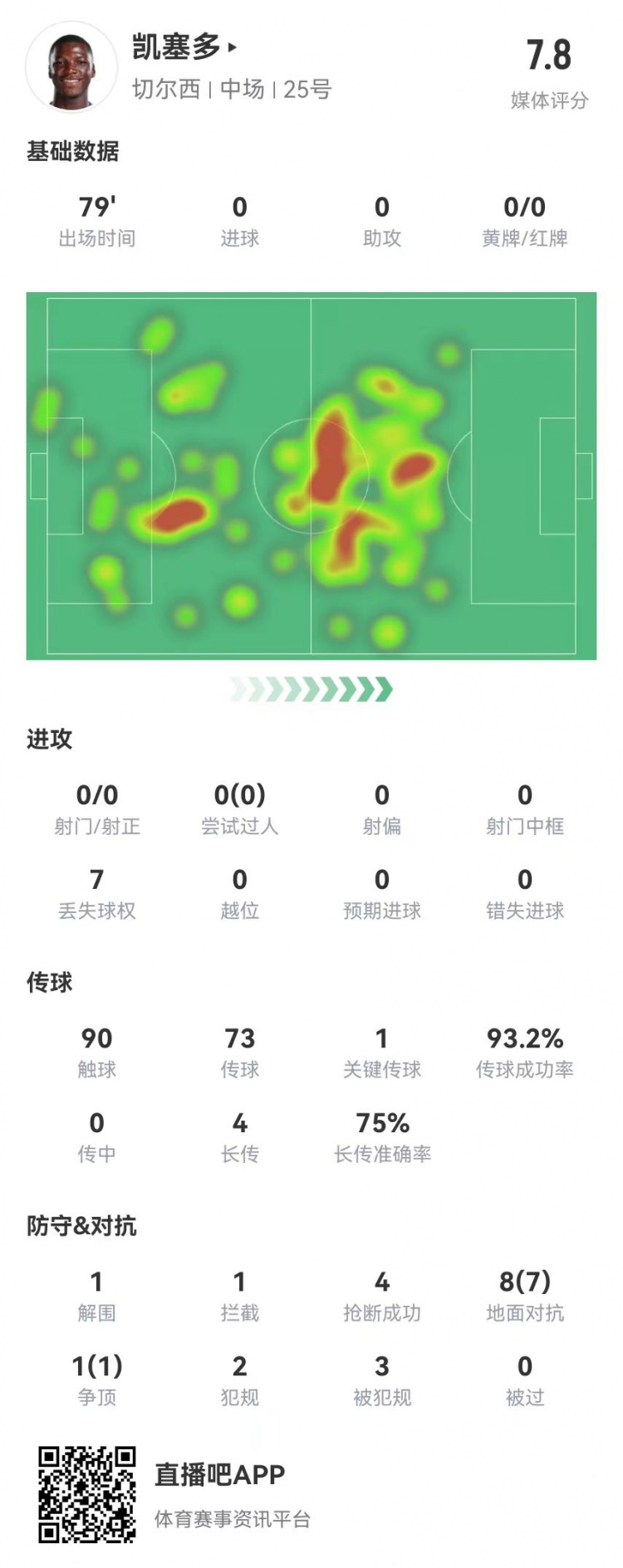 凱塞多本場(chǎng)9對(duì)抗8成功+4搶斷3造犯規(guī) 3成功長(zhǎng)傳 獲評(píng)7.8分