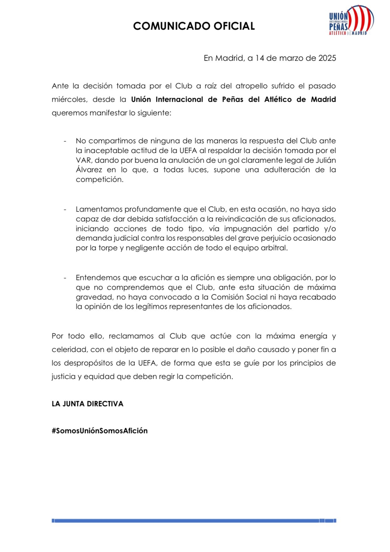 我們完全不認(rèn)同俱樂部對(duì)歐足聯(lián)不可接受態(tài)度的回應(yīng),歐足聯(lián)支持VAR的決定,認(rèn)定胡阿爾瓦雷斯的一個(gè)明顯合法的進(jìn)球無效,這顯然是對(duì)比賽的篡改。