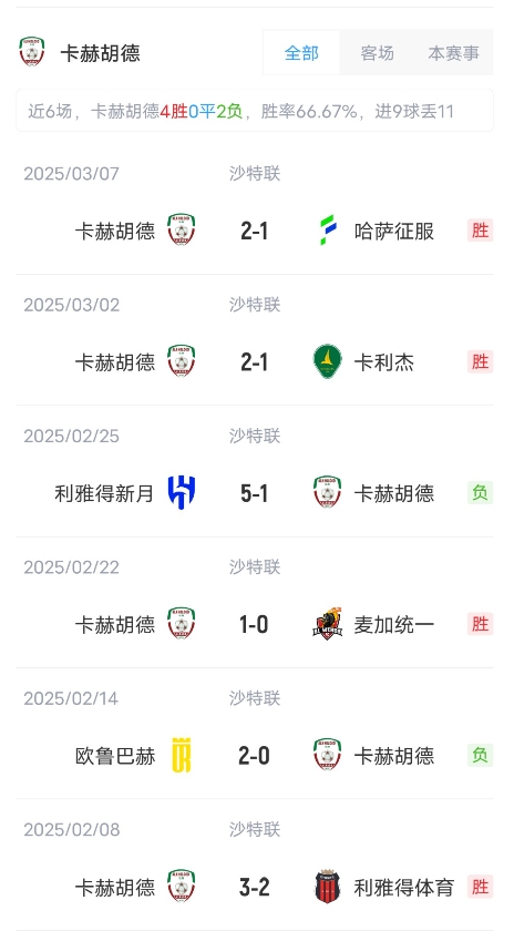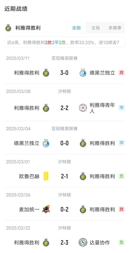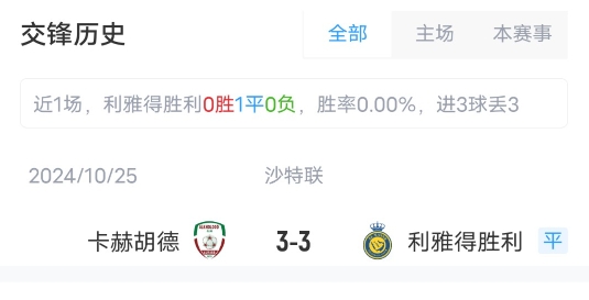 目前利雅得勝利取得了14勝6平4負(fù)的成績,積48分,暫居聯(lián)賽第4??ê蘸氯〉昧?勝4平11負(fù)成績,積31分,暫居聯(lián)賽第10。