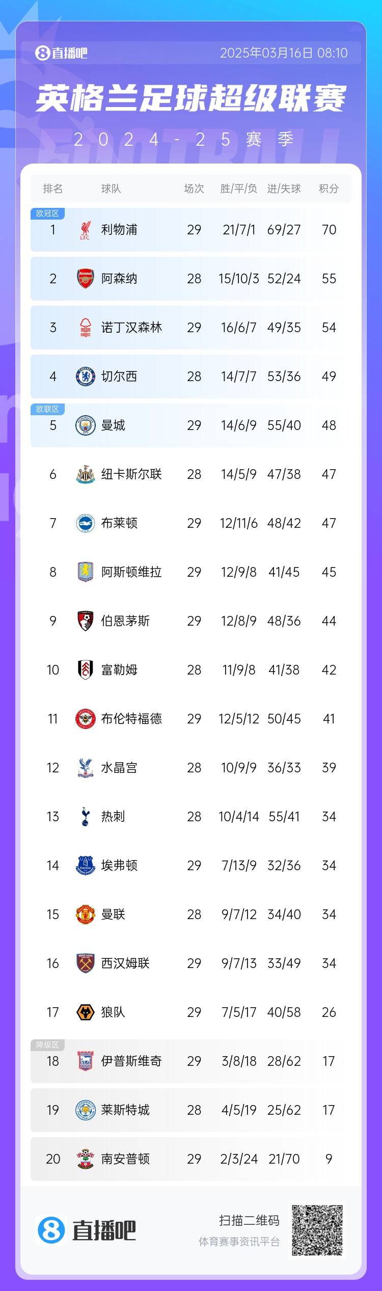 南安普頓29輪之后只有9分,基本是穩(wěn)穩(wěn)降級。同在降級區(qū)的伊普斯維奇本輪2-4不敵諾丁漢森林,萊斯特城還未賽,本輪將戰(zhàn)曼聯(lián)。