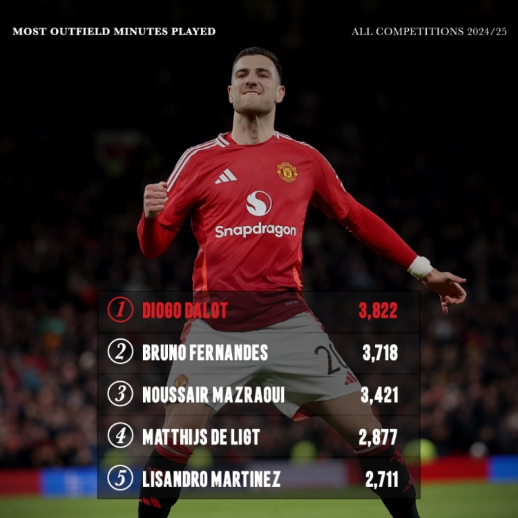 本賽季曼聯(lián)非門將出場(chǎng)時(shí)間榜:達(dá)洛特壓B費(fèi)居首,馬茲拉維在列