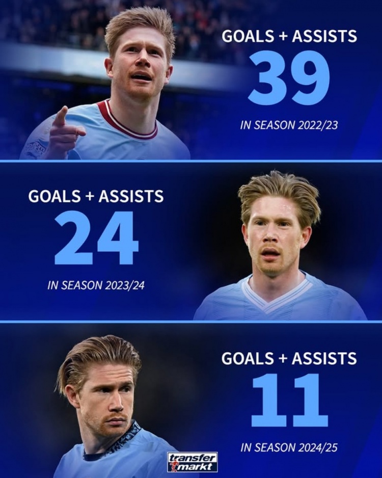 3月16日訊 曼城在本輪英超2-2戰(zhàn)平布萊頓,德布勞內(nèi)最后時(shí)刻替補(bǔ)登場,《轉(zhuǎn)會(huì)市場》統(tǒng)計(jì)顯示他的關(guān)鍵數(shù)據(jù)近年持續(xù)下滑: