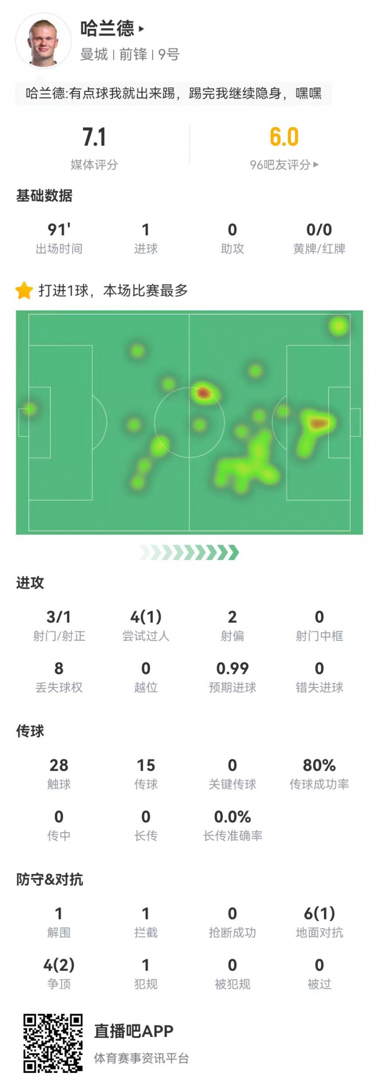 哈蘭德本場3射1正進1球 4過人1成功 10對抗3成功 獲評7.1分
