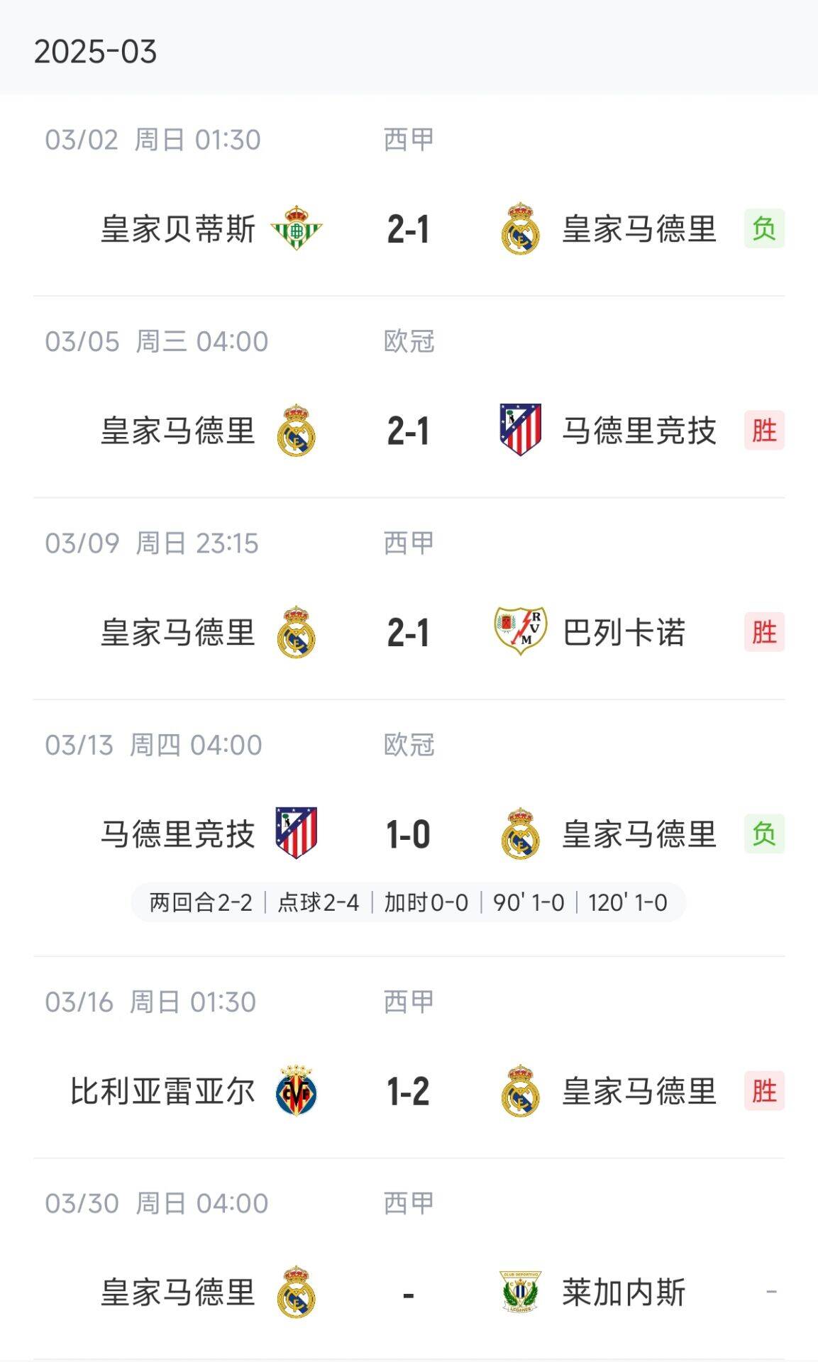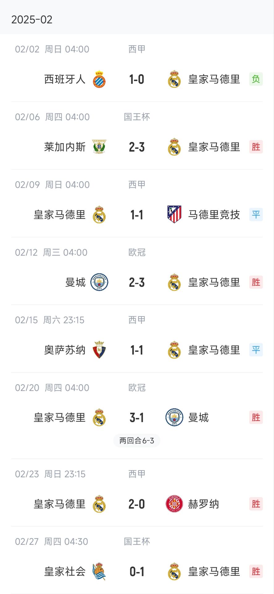 2月份皇馬在25天里打了8場,平均3天一場,包括西甲、國王杯、歐冠。