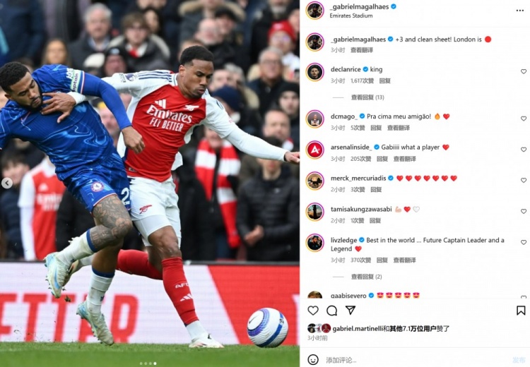 本場比賽加布里埃爾發(fā)揮出色,賽后當(dāng)選英超官方球迷票選全場最佳,賽后他也在社媒曬出本場與里斯-詹姆斯對抗照片,配文寫道:“拿下三分并完成零封,倫敦是紅色的!”