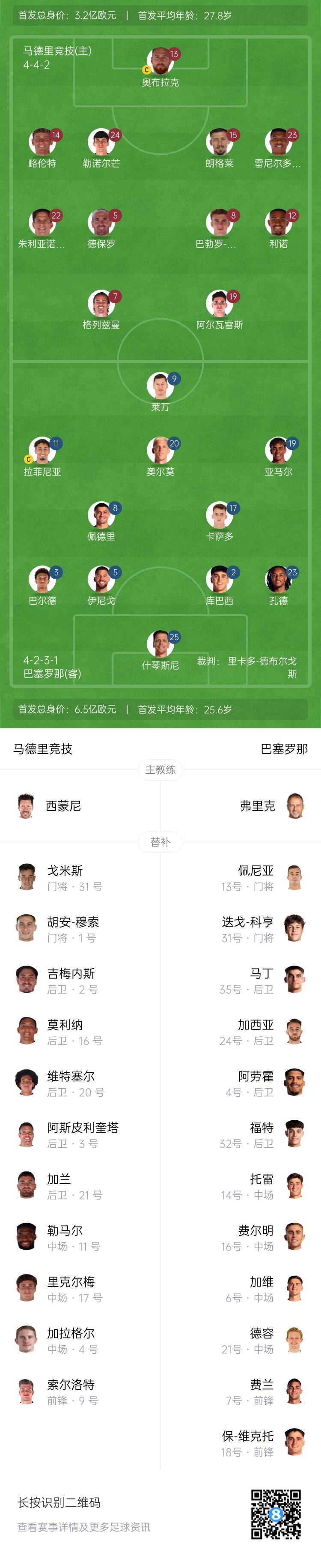 巴薩首發(fā):25-什琴斯尼、23-孔德、2-庫巴西、5-伊尼戈-馬丁內(nèi)斯、3-巴爾德、17-卡薩多、8-佩德里、20-奧爾莫、19-亞馬爾、11-拉菲尼亞、9-萊萬