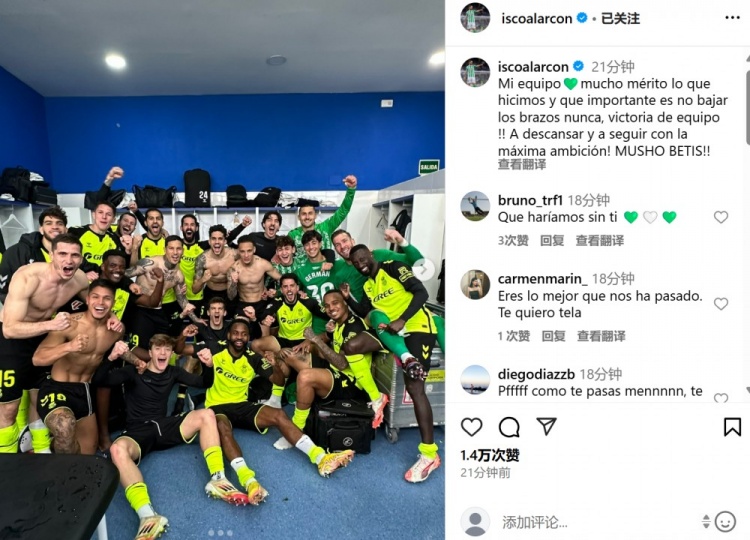 本場(chǎng)比賽伊斯科點(diǎn)射破門(mén)拉響反擊號(hào)角,賽后伊斯科也在社媒曬出更衣室內(nèi)全隊(duì)球員慶祝合影,配文寫(xiě)道:“我的球隊(duì)????我們做到的事情值得被認(rèn)可,永不放棄太重要了。這是一場(chǎng)團(tuán)隊(duì)的勝利,現(xiàn)在是時(shí)候休息調(diào)整,以最高昂的斗志繼續(xù)前進(jìn)。貝蒂斯加油!