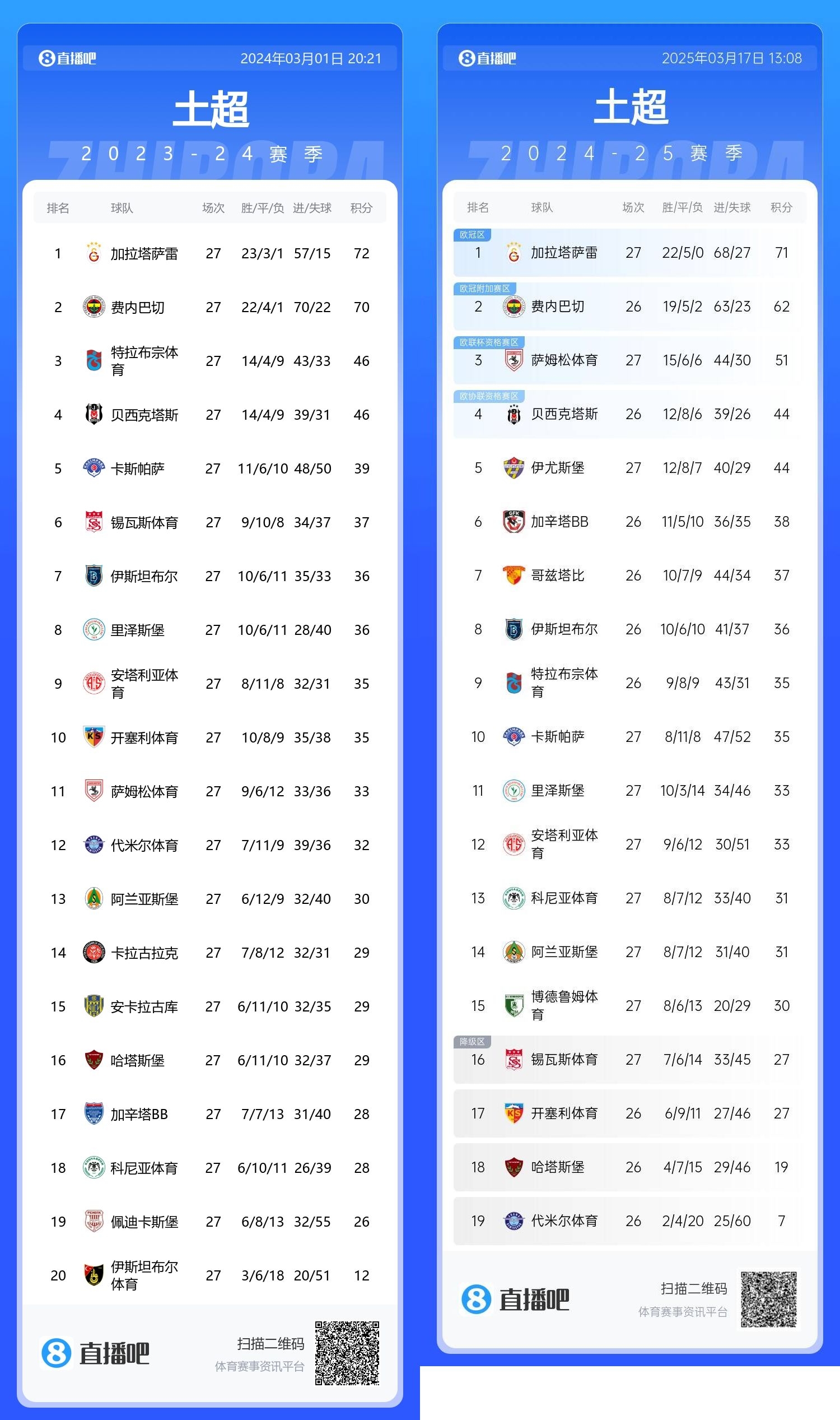 到了本賽季,加拉塔薩雷延續(xù)無敵的表現,27場比賽后拿到71分,只比去年少1分,但費內巴切卻有一些掉隊了。盡管目前費內巴切少賽一場領先第3名也有11分之多,但落后榜首加拉塔薩雷已9分。今年費內巴切的爭冠形式并不樂觀,二人轉的局面漸漸有些偏向獨角戲了…