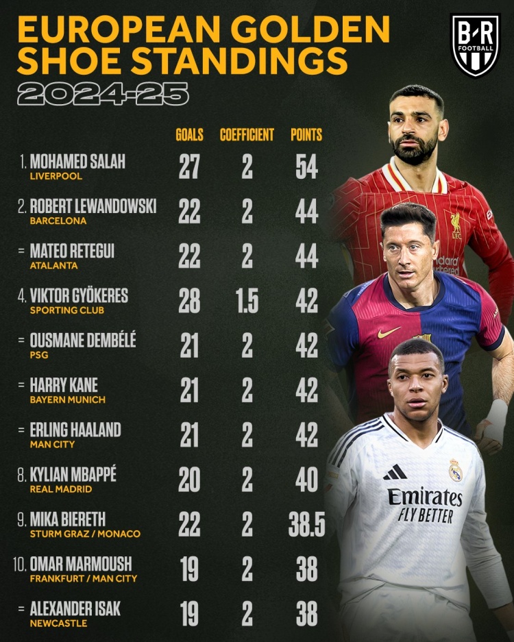 3月18日訊 B/R Fooball統(tǒng)計(jì)了本賽季球員的聯(lián)賽進(jìn)球數(shù)量,并列出歐洲金靴排名,薩拉赫54分領(lǐng)跑,萊萬、雷特吉44分次席。