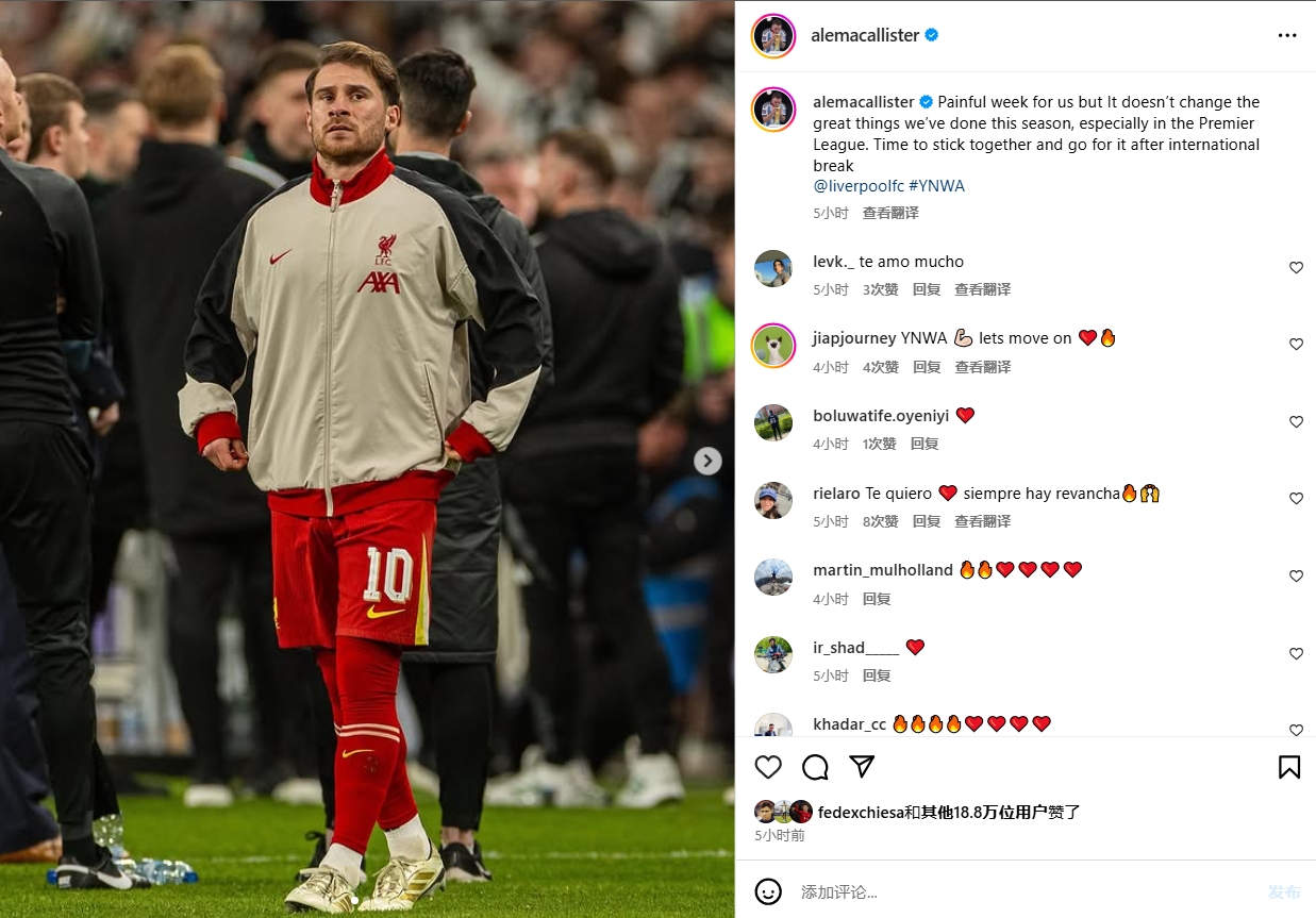 麥卡利斯特在社交媒體上寫道:“對(duì)我們來說,這是痛苦的一周,但這不會(huì)改變我們本賽季的出色表現(xiàn),特別是在英超聯(lián)賽中。是時(shí)候團(tuán)結(jié)一致,在國(guó)際比賽日之后全力以赴了。”