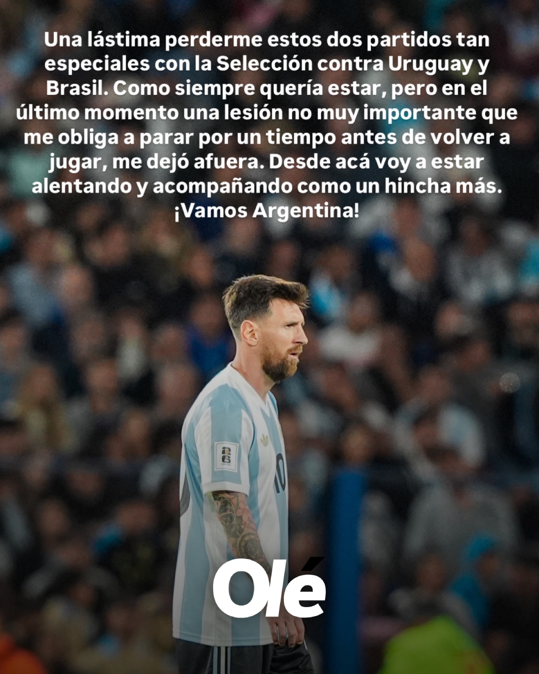 隨后,梅西在社媒上發(fā)文表示:“非常遺憾我將錯過與烏拉圭和巴西的兩場比賽。盡管我始終渴望參賽,但最后一刻出現(xiàn)的輕微傷勢迫使我必須休養(yǎng)一段時間才能重返賽場,這讓我無法參與此次賽事。在此我將作為一名普通球迷繼續(xù)為球隊加油助威。阿根廷加油!”