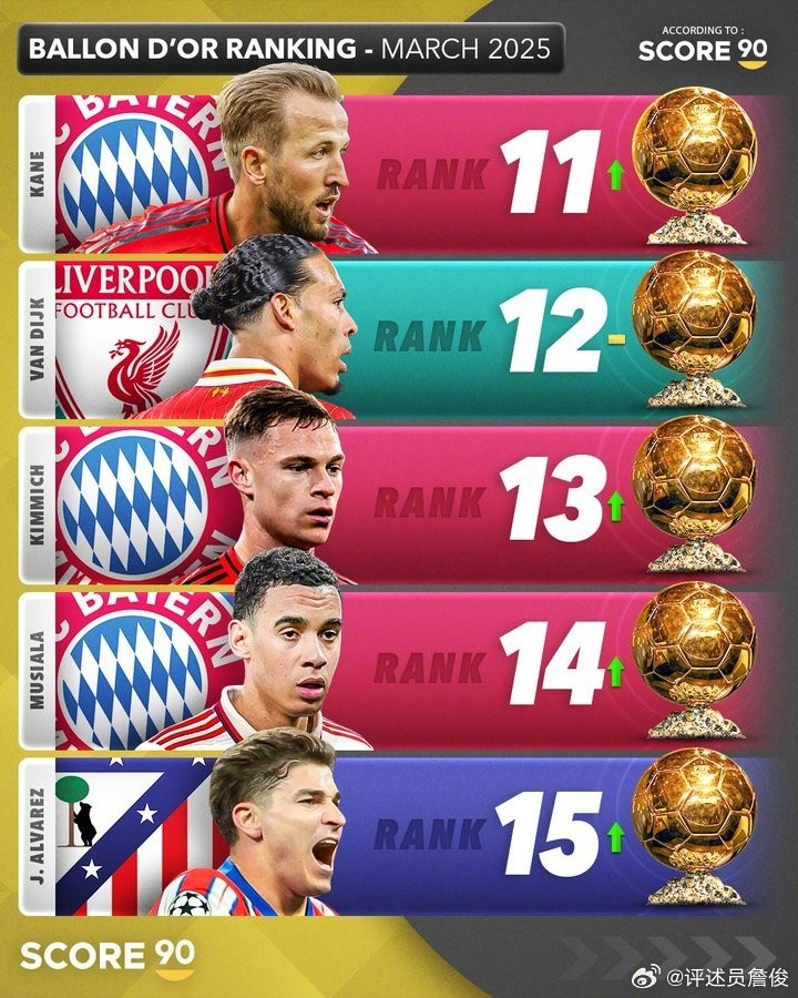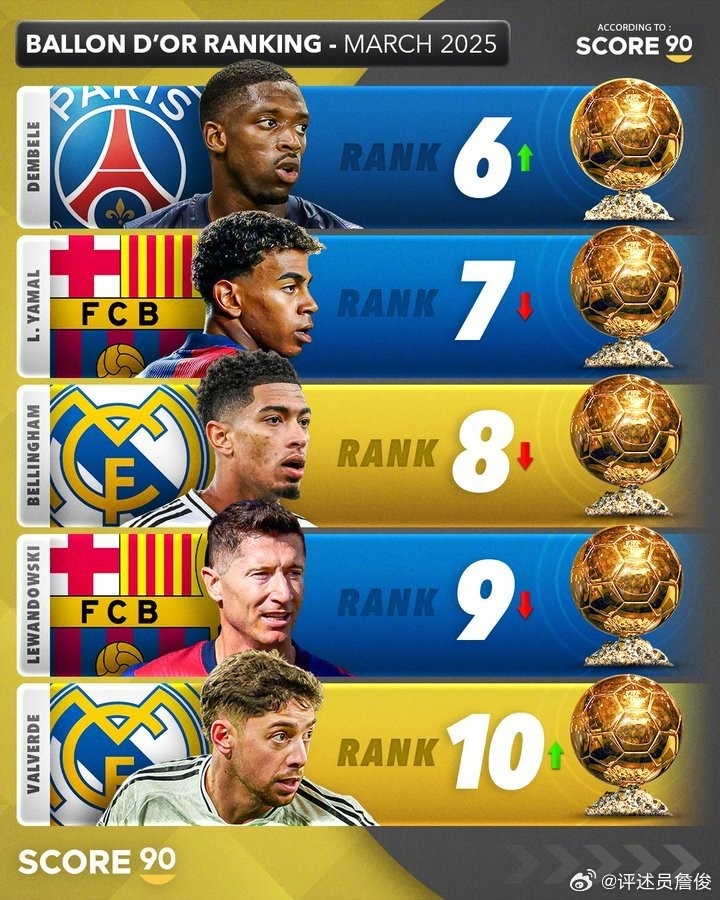 詹俊說:國(guó)外網(wǎng)站評(píng)分系統(tǒng)中2025年金球獎(jiǎng)熱門人選前十五名。本季已經(jīng)打進(jìn)30球迎來個(gè)人職業(yè)生涯巔峰的登貝萊,會(huì)不會(huì)是“黑馬”?如果大巴黎本季歐冠最終捧杯的話……