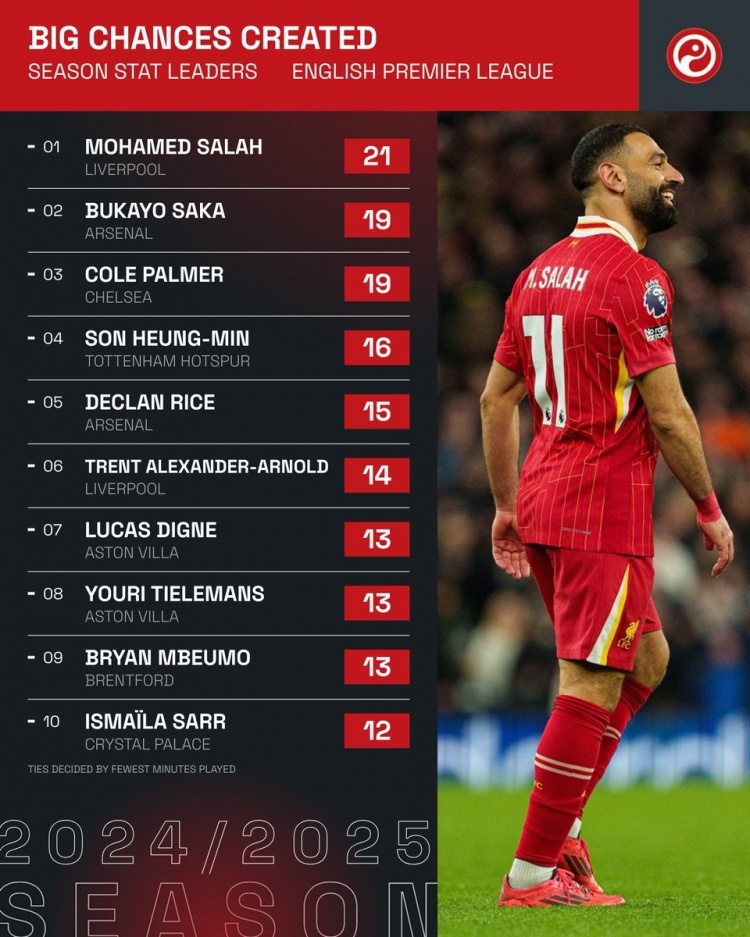 本賽季英超創(chuàng)造重大機會榜:薩拉赫21次居首,薩卡&帕爾默19次
