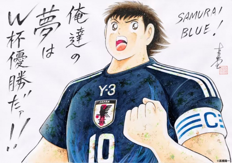 這是高橋陽一在3月世預(yù)賽期間特意為日本隊設(shè)計的應(yīng)援插畫,插畫上是大空翼穿著日本國家隊球衣用力握拳的模樣,并寫著:“我們的夢想是世界杯冠軍??!”。