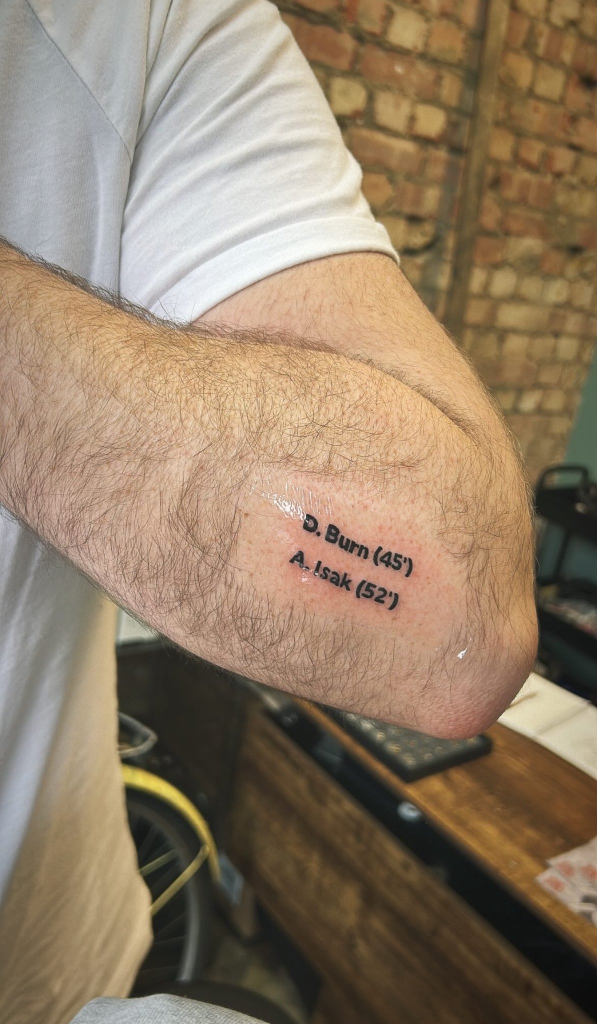 70年1次!聯(lián)賽杯奪冠后 紐卡球迷把丹伯恩和伊薩克姓名紋到手臂上