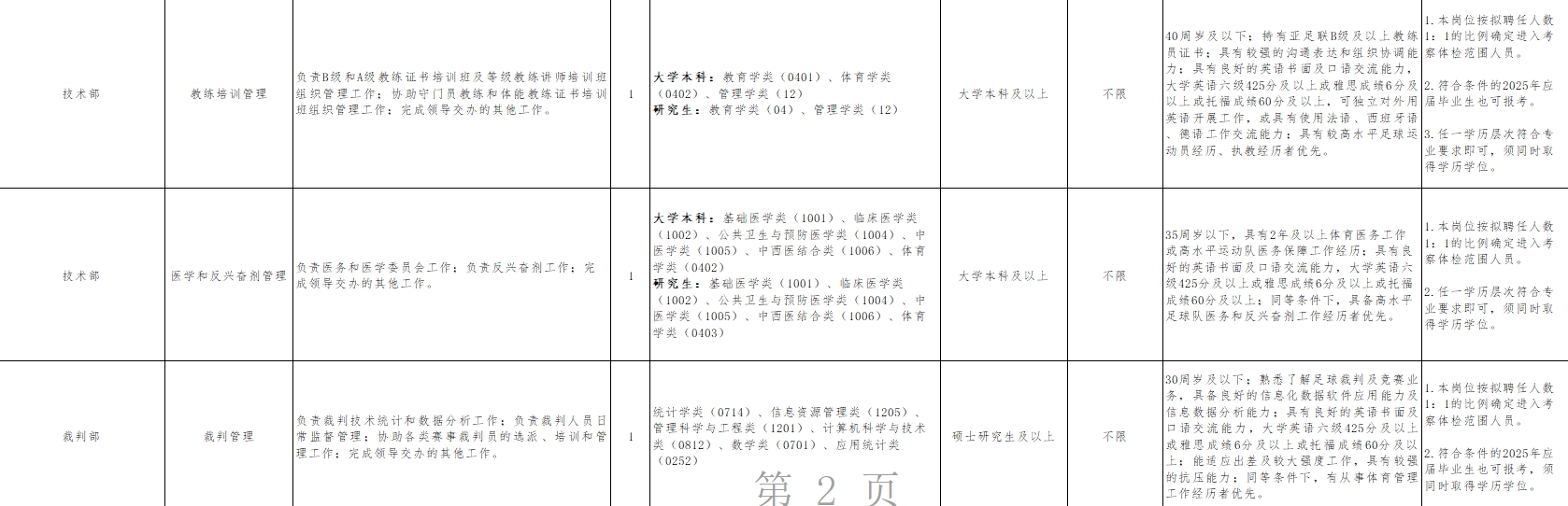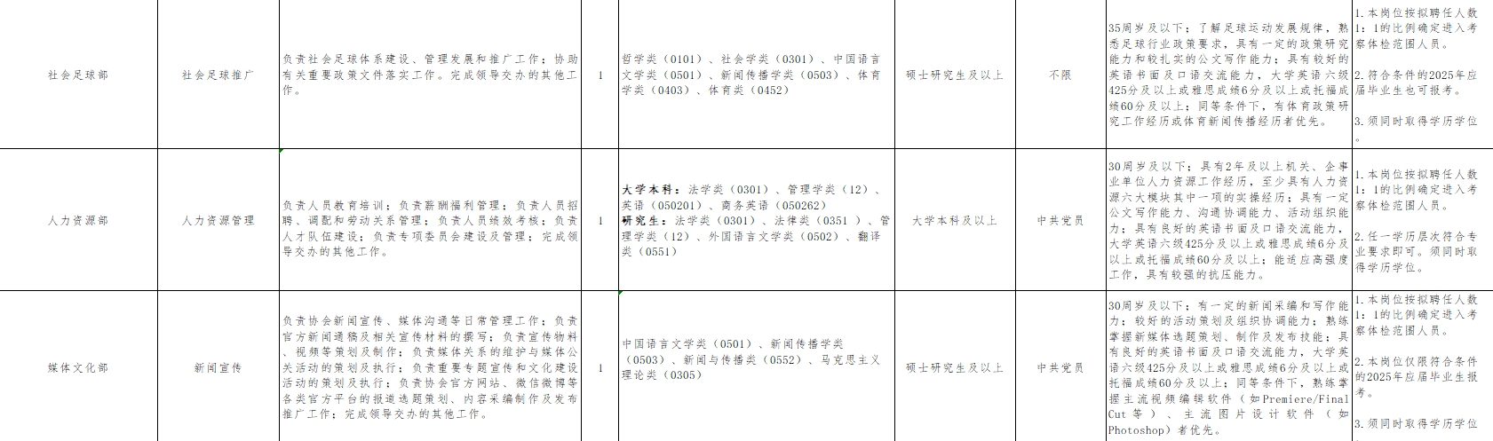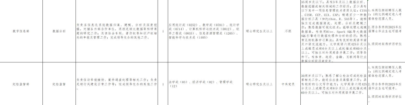 另外,綜合部(財務(wù)審核)、國家隊(duì)管理部(隊(duì)伍管理)、裁判部(裁判管理)、社會足球部(社會足球推廣)、媒體文化部(新聞宣傳)、數(shù)字信息部(數(shù)據(jù)分析)、紀(jì)檢監(jiān)督部(紀(jì)檢監(jiān)督)要求學(xué)歷為碩士研究生及以上,其余崗位為大學(xué)本科及以上。