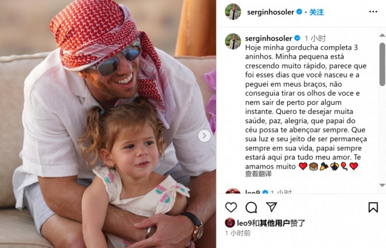 2月24日訊 國(guó)安中場(chǎng)塞爾吉尼奧更新社媒,他為三歲的女兒送上生日祝福。