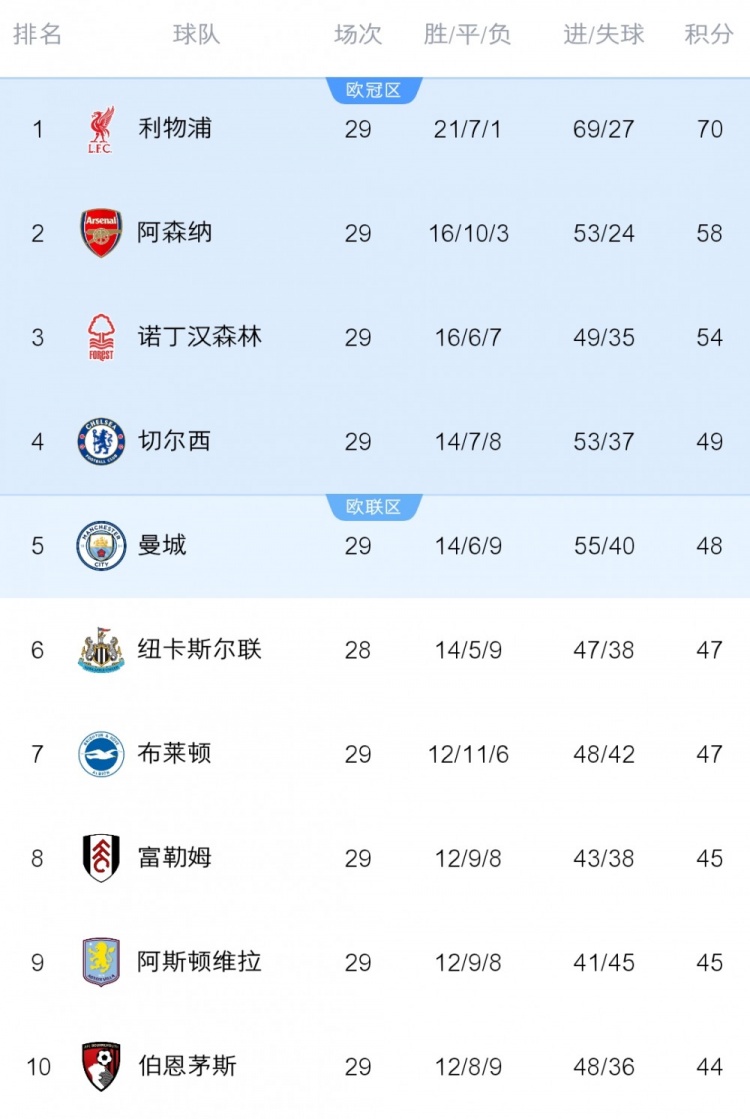 OPTA預(yù)測(cè)英超爭(zhēng)五概率:森林85.6%領(lǐng)跑,曼城紐卡藍(lán)軍次之