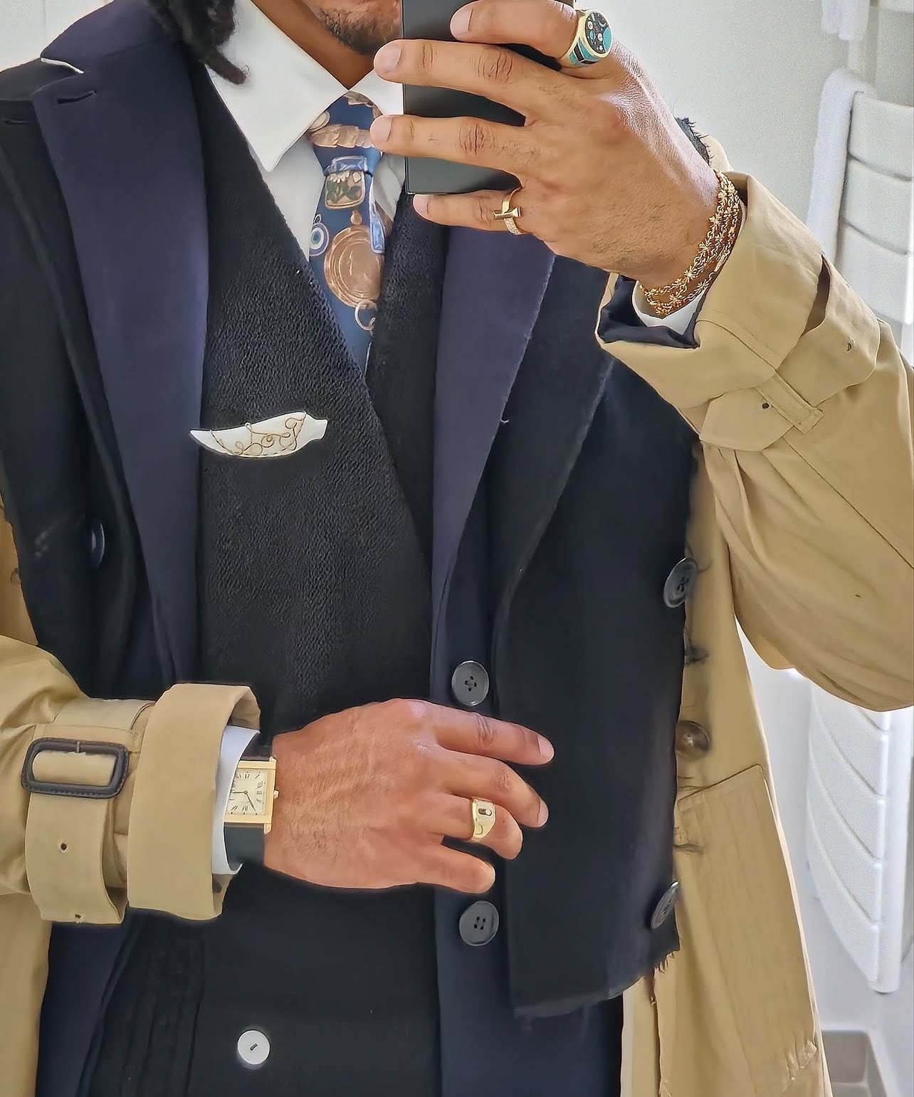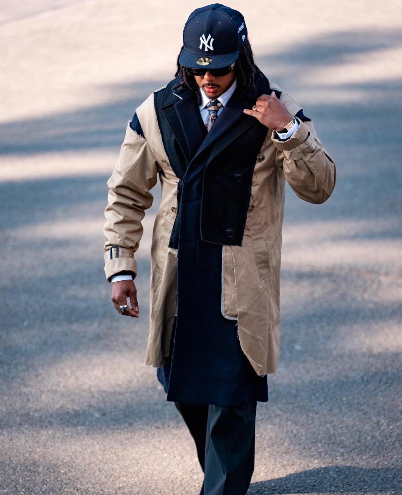 這一次孔德的穿搭中,最引人注目的就是他身上的拼接外套,這件大衣來(lái)自日本小眾設(shè)計(jì)師品牌FACETASM,是2022-23的秋冬系列中的一件。