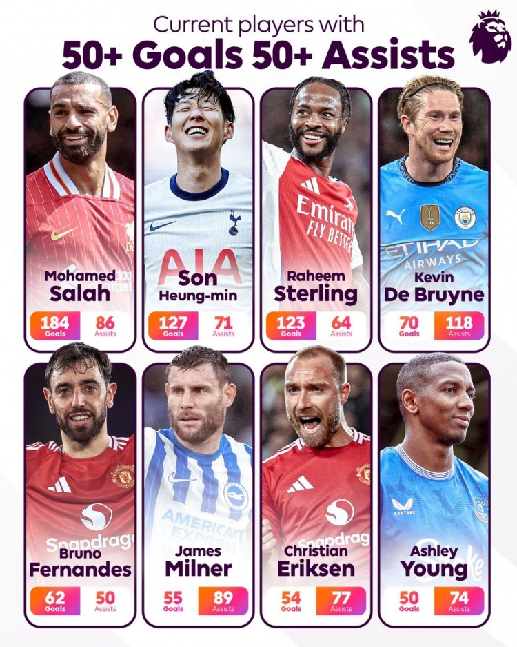 官方統(tǒng)計當(dāng)前仍效力英超進(jìn)球+助攻雙50+球員: