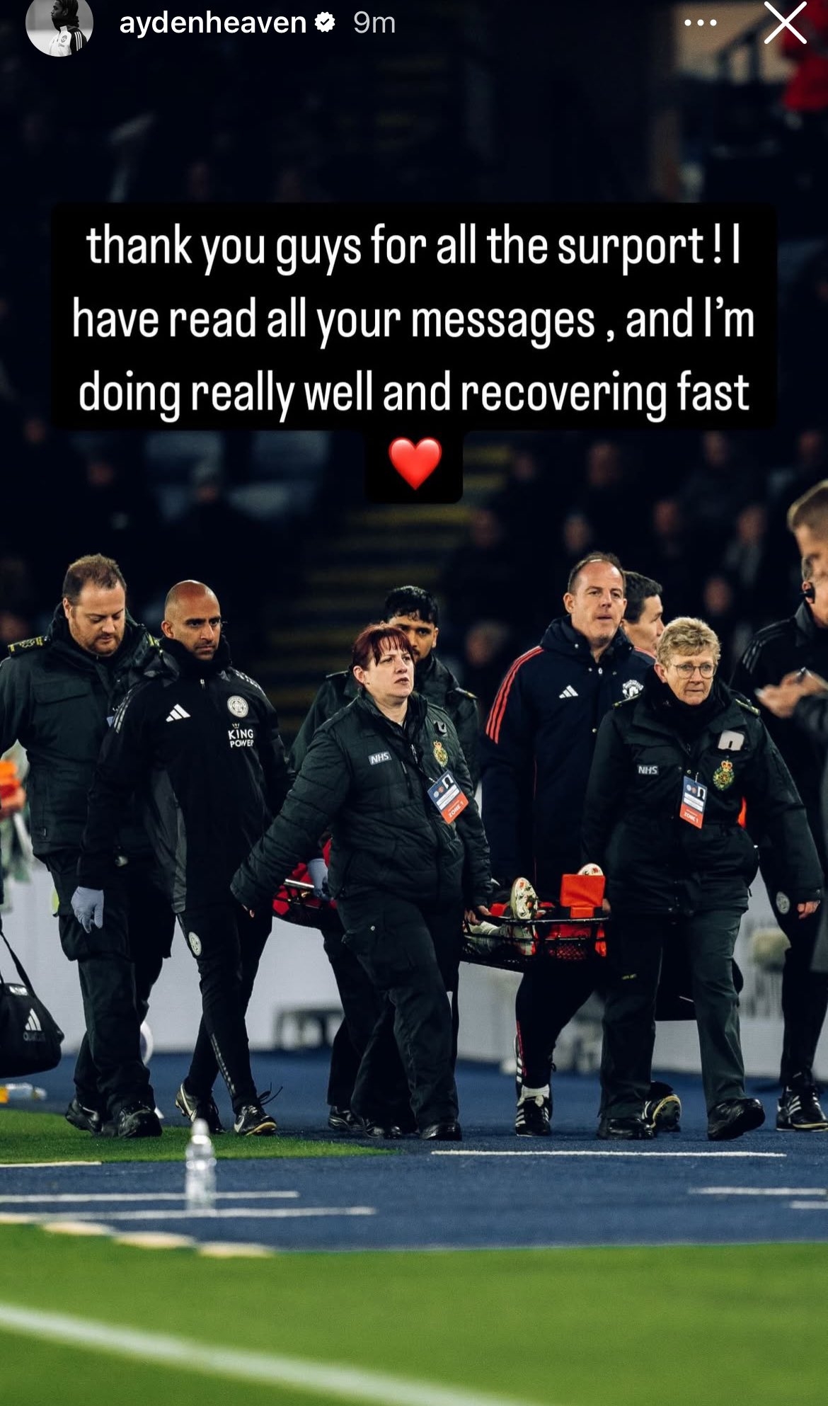 曼聯(lián)在本輪英超3-0客勝萊斯特城,18歲中衛(wèi)海文首發(fā)因傷被擔(dān)架抬離球場。這名小將如今在社媒談到了自己的傷情。