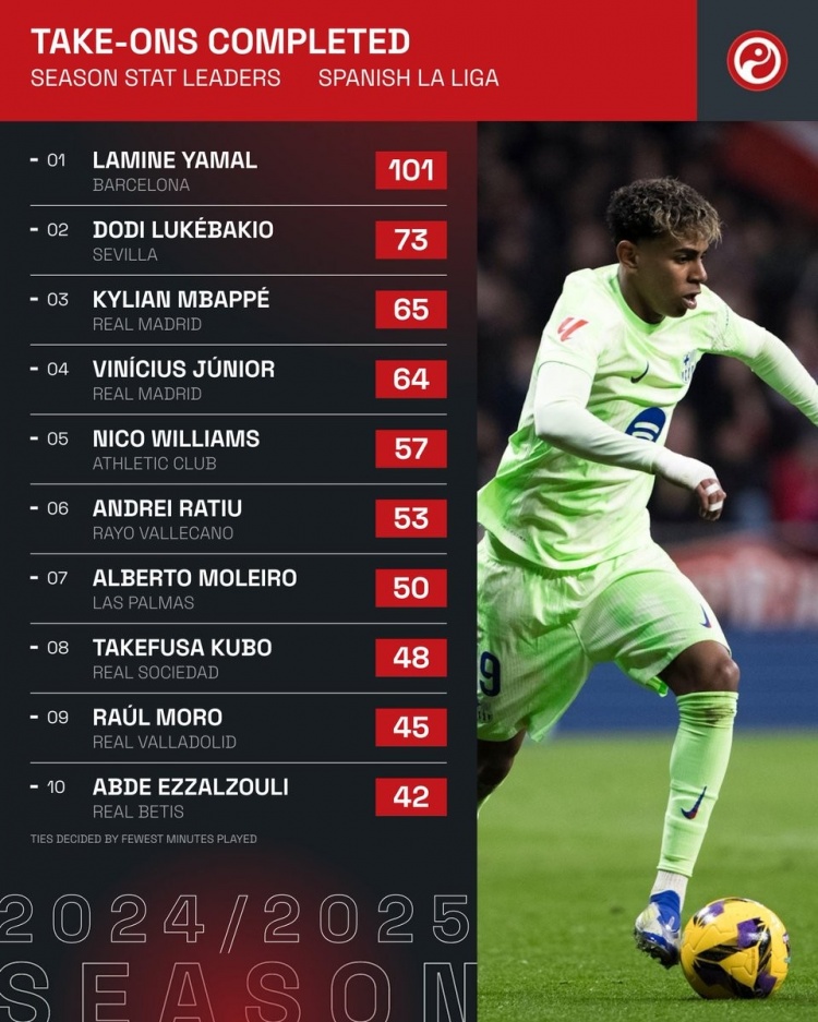 3月19日訊 國家隊(duì)比賽周到來,西甲也暫時(shí)告一段落,squakwa統(tǒng)計(jì)了本賽季西甲成功過人情況,亞馬爾斷崖領(lǐng)跑。