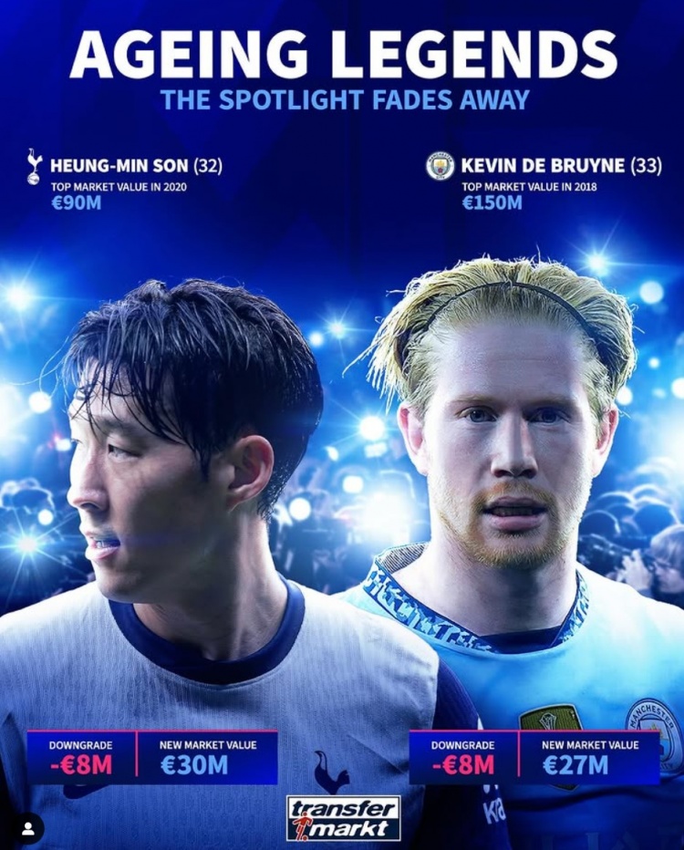 32歲孫興慜&33歲德布勞內(nèi)身價各降800萬歐,巔峰身價9千萬&1.5億