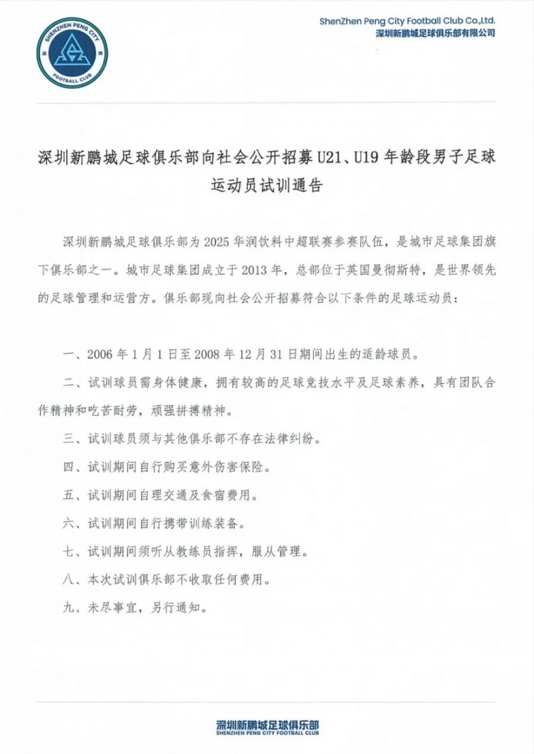 深圳新鵬城足球俱樂部公開招募U21、U19、U17年齡段男子足球運(yùn)動(dòng)員試訓(xùn)通告