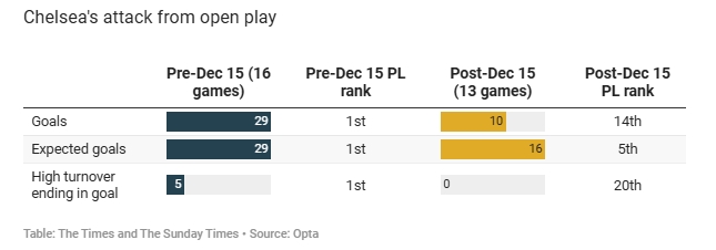 另外,切爾西在英超前16輪中利用高位失誤打進(jìn)了5粒進(jìn)球排名第一,而最近13輪比賽該項數(shù)據(jù)為0。