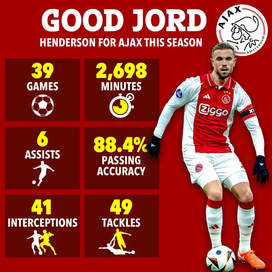 本賽季,喬丹-亨德森在阿賈克斯發(fā)揮不俗,他出戰(zhàn)39場比賽共計2698分鐘,貢獻(xiàn)6次助攻,傳球成功率88.4%,同時還有41次攔截和49次鏟搶。