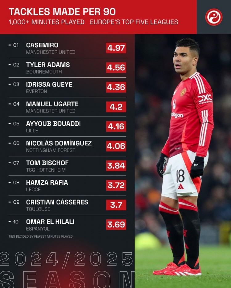 3月19日訊 Squawka統(tǒng)計(jì)了本賽季球員在五大聯(lián)賽每90分鐘完成搶斷的次數(shù),并列出榜單,卡塞米羅4.97次居首,亞當(dāng)斯、蓋耶二三位。