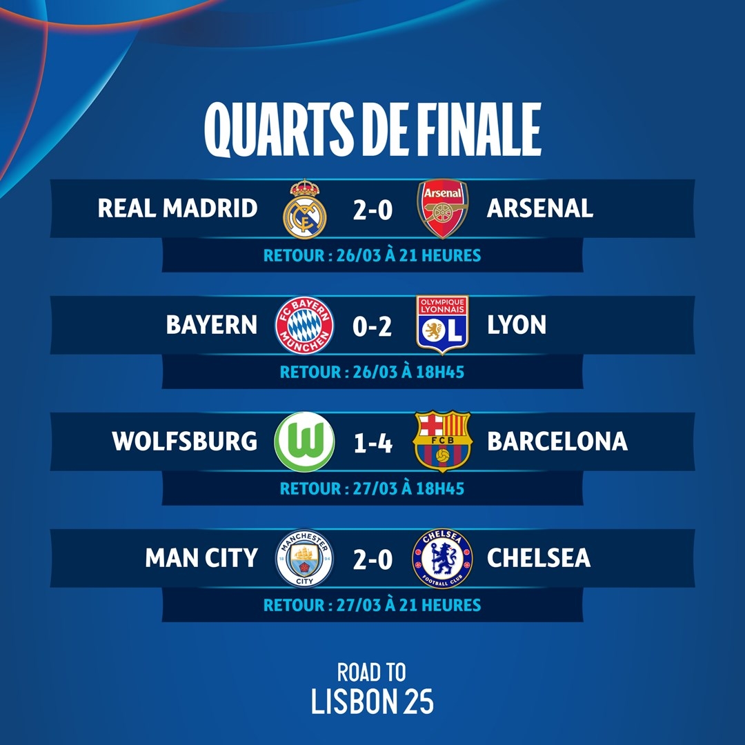 次回合比賽將于下周進(jìn)行,3月27號(hào)里昂女足對(duì)陣拜仁女足、阿森納女足對(duì)陣皇馬女足,28號(hào)巴薩女足對(duì)陣沃爾夫斯堡女足、切爾西女足對(duì)陣曼城女足。