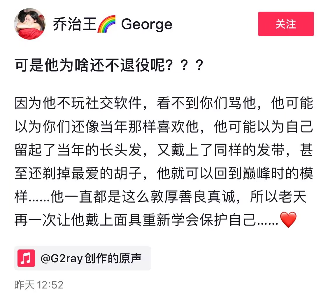 因為他不玩社交軟件,看不到你們罵他,他可能以為你們還像當(dāng)年那樣喜歡他,他可能以為自己留起了當(dāng)年的長頭發(fā),又戴上了同樣的發(fā)帶,甚至還剃掉最愛的胡子,他就可以回到巔峰時的模樣…… 他一直都是這么敦厚善良真誠,所以老天再一次讓他戴上面具重新學(xué)會保護(hù)自己……?