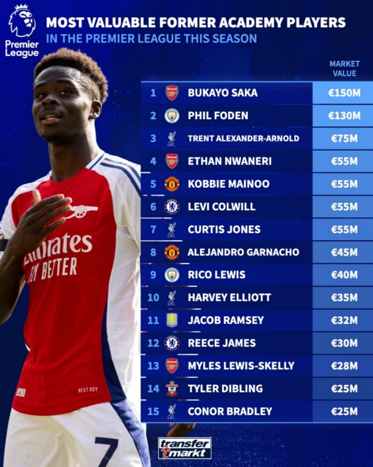 3月20日訊 德轉(zhuǎn)此前更新了英超球員身價,并盤點(diǎn)了本賽季出自球隊(duì)青訓(xùn)的球員中身價最高榜單,其中薩卡居首,福登次席,具體如下: