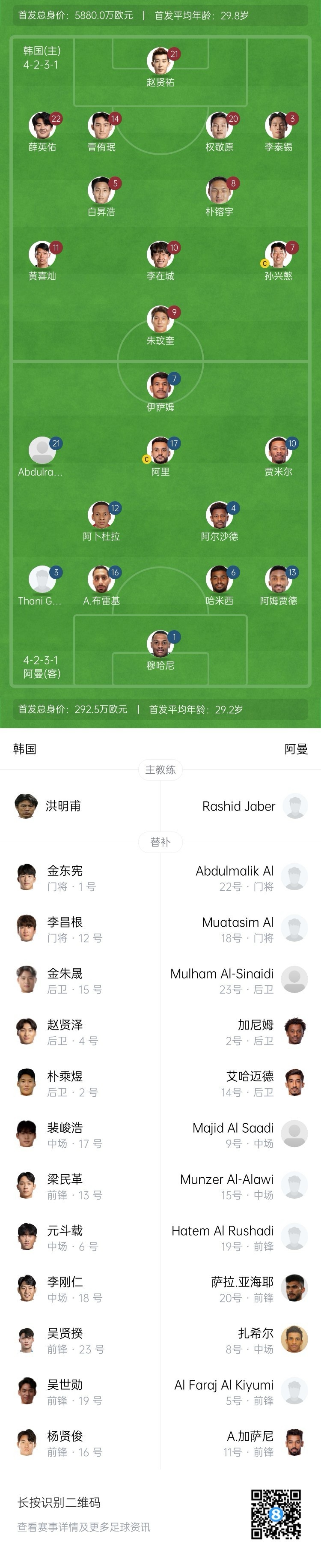 3月20日訊 北京時(shí)間3月20日19:00,世預(yù)賽亞洲區(qū)18強(qiáng)賽B組第7輪,韓國(guó)隊(duì)主場(chǎng)對(duì)陣阿曼隊(duì),雙方首發(fā)已經(jīng)公布。目前在該小組積分榜,韓國(guó)隊(duì)14分領(lǐng)跑,阿曼隊(duì)6分排在第四位。