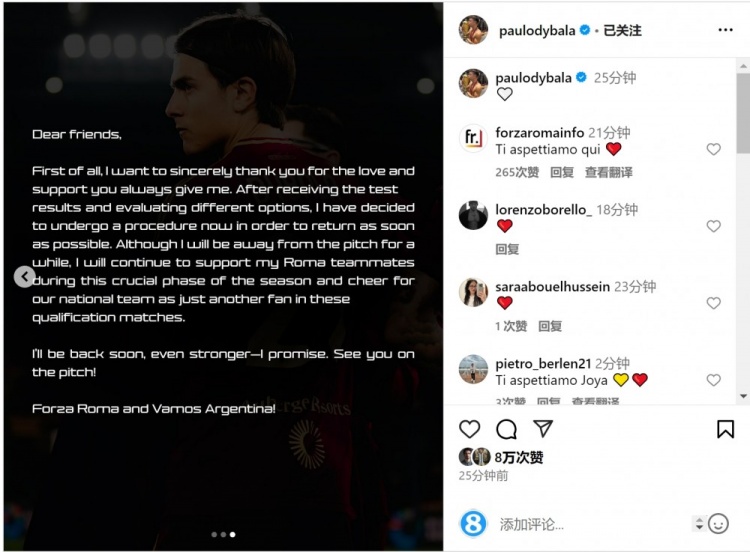 3月20日訊 羅馬官方確認(rèn)迪巴拉肌腱受傷,將在未來幾天接受手術(shù)。迪巴拉社媒發(fā)文感謝球迷的支持,并表示很快就會回歸。