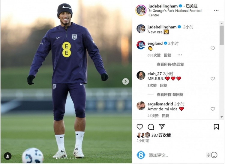 貝林厄姆隨英格蘭隊(duì)備戰(zhàn)世預(yù)賽,他在社交媒體上曬出訓(xùn)練照片,并配文:“新時(shí)代????”