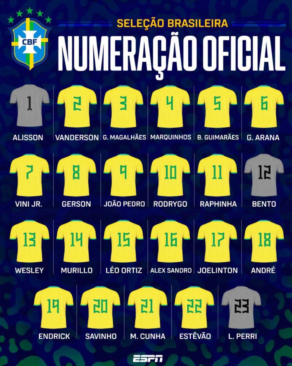 03月20日訊 巴西國(guó)家隊(duì)公布新一期球員號(hào)碼,其中維尼修斯7號(hào),羅德里戈10號(hào),若昂-佩德羅9號(hào),恩德里克19號(hào)。