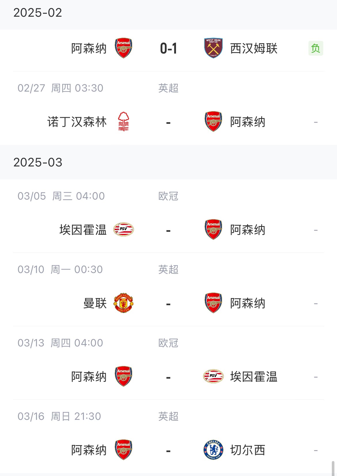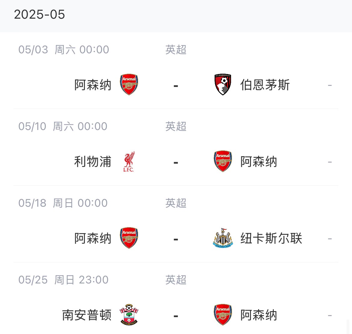 阿森納賽程: