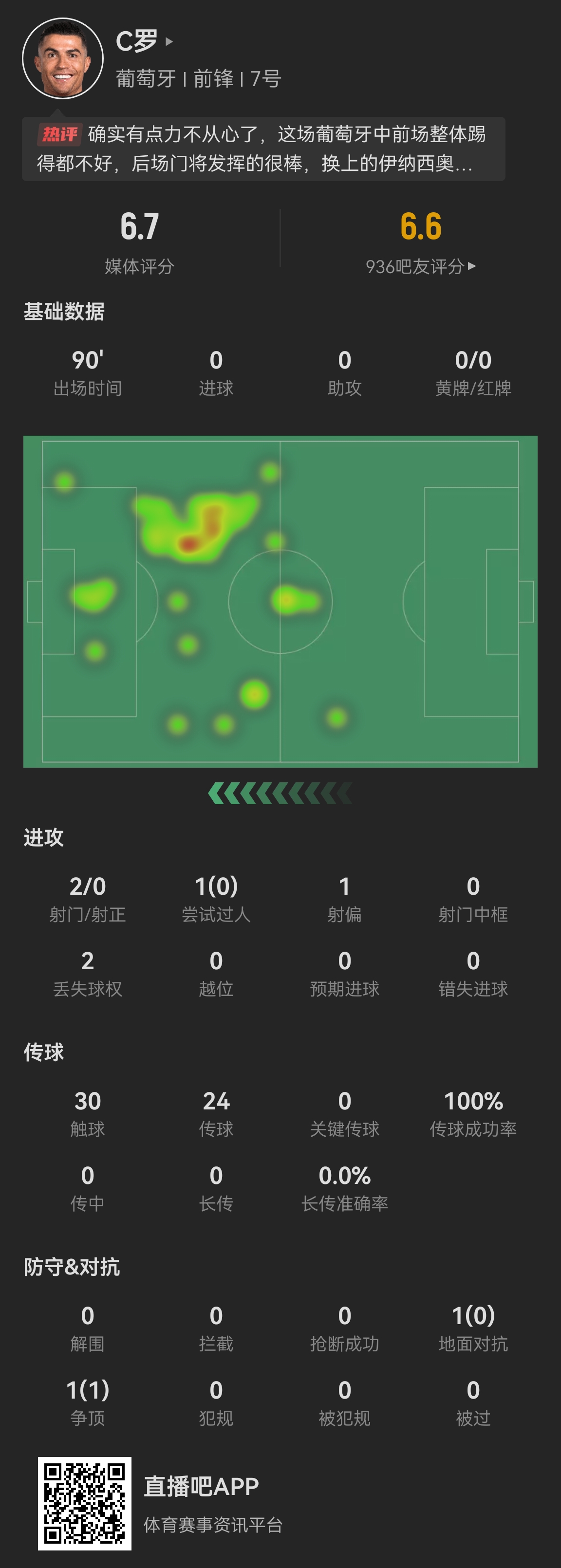 40歲的C羅首發(fā)出場,打滿了全場,觸球30次,獲評(píng)6.7分,這兩項(xiàng)數(shù)據(jù)均為葡萄牙首發(fā)球員最低。