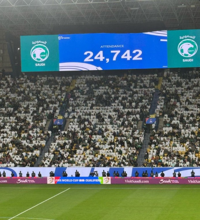 國(guó)足0-1客負(fù)沙特,本場(chǎng)比賽現(xiàn)場(chǎng)觀眾人數(shù)為24742人